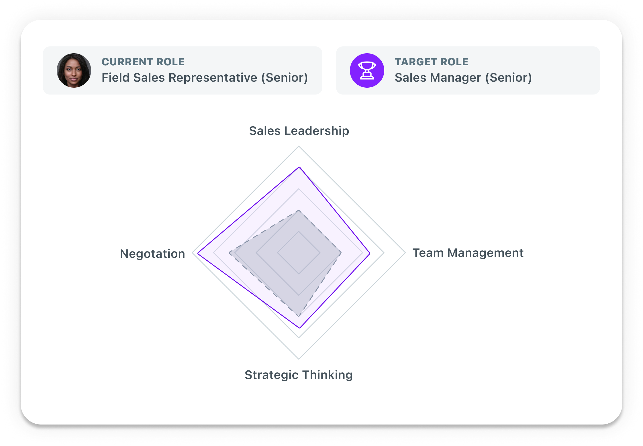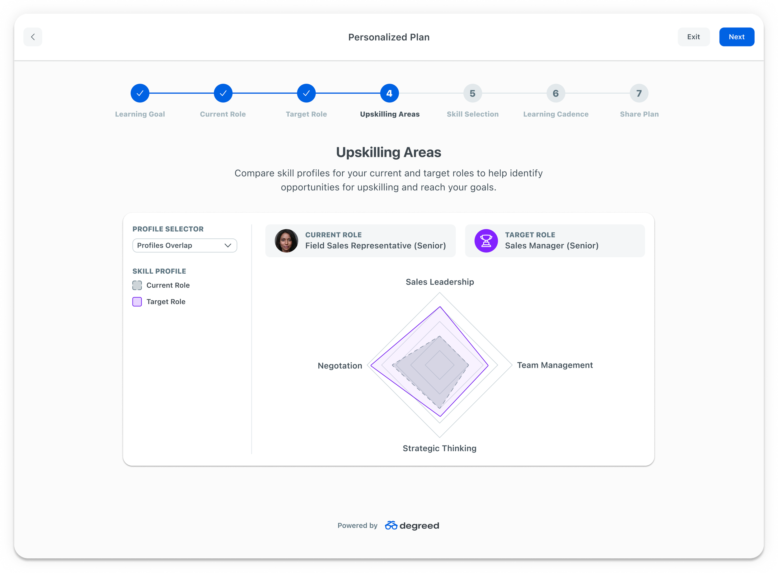 In this step, we ask the learner to review skill profiles for their current and selected target role. The graph visually overlaps both skill profiles to help quickly identify growth areas.
