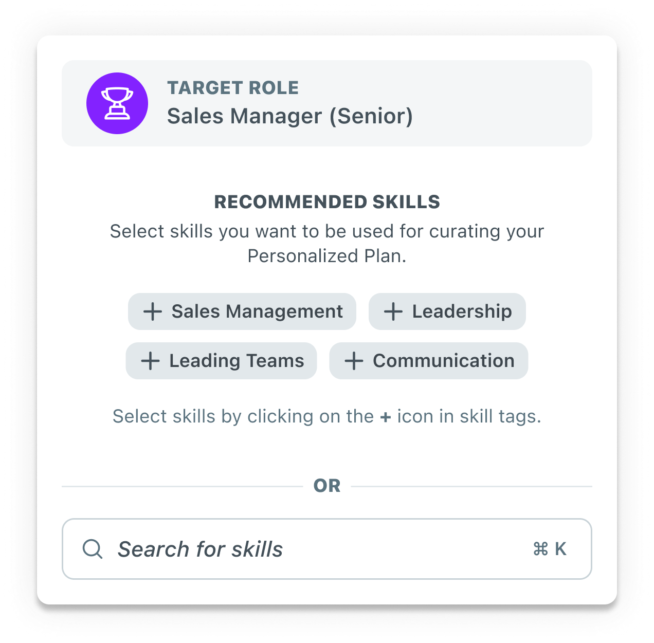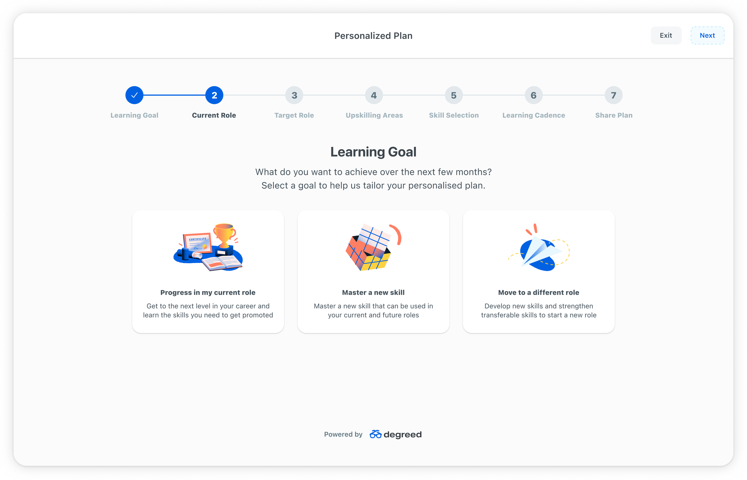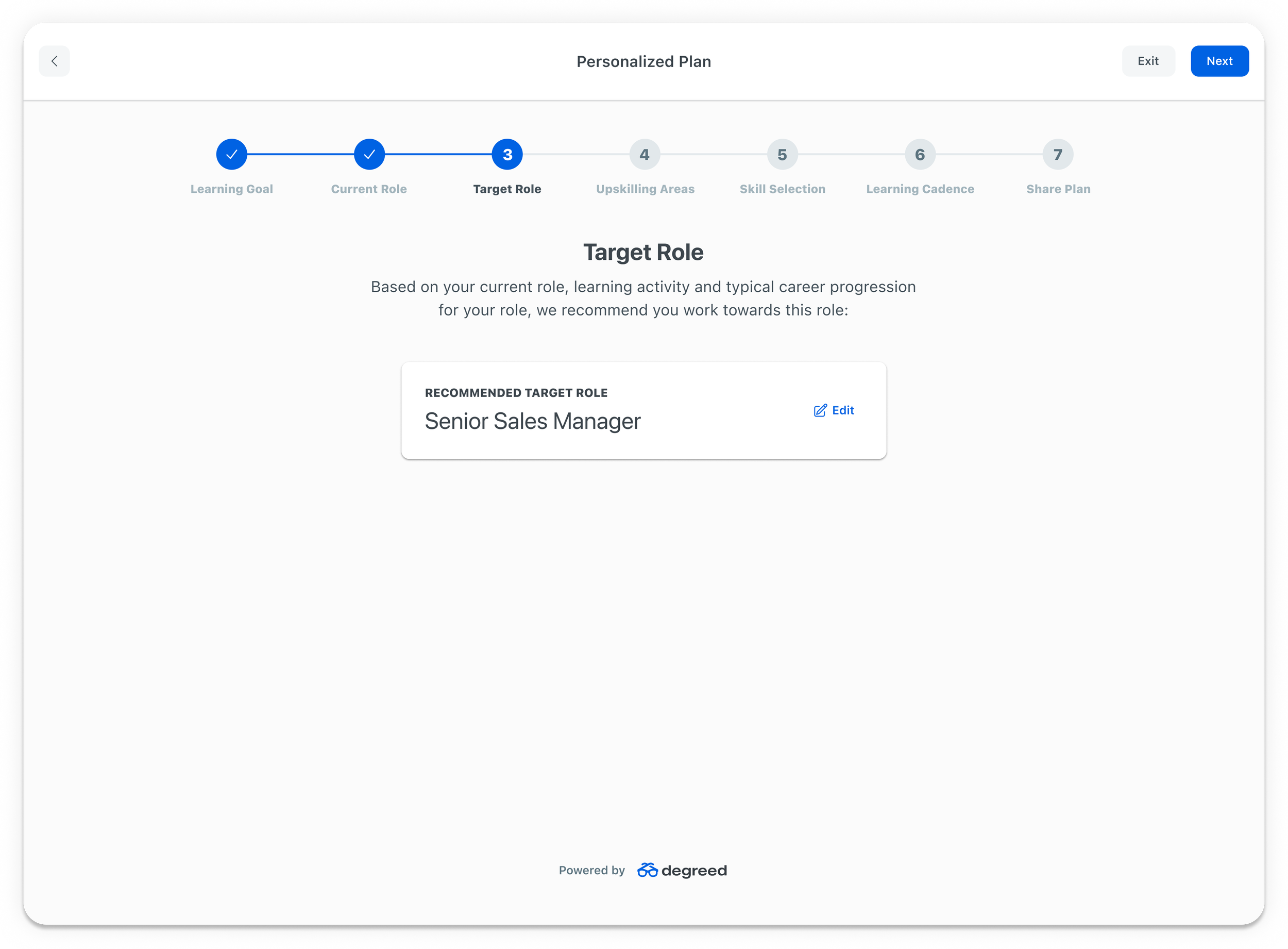 In this step, we ask learners to confirm their current role and use AI to recommend a typical next role based on the learner’s unique profile. We leverage various algorithms and data-driven techniques to match learners with suitable roles.