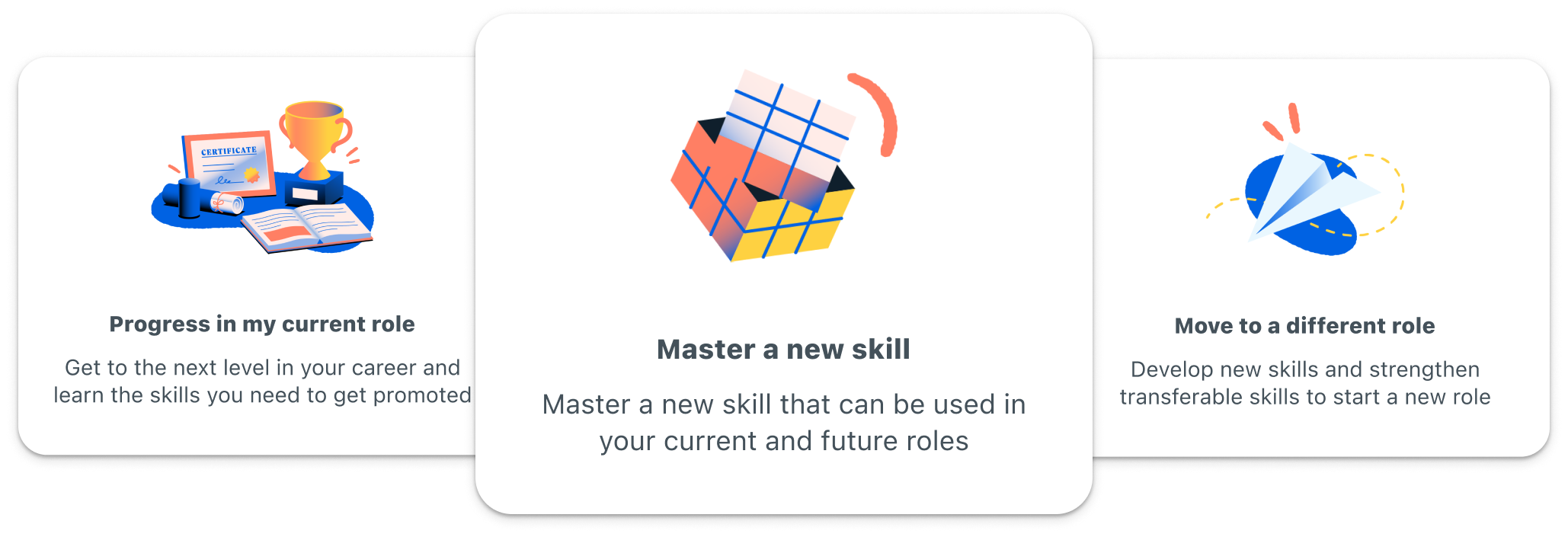 The first step in the personalised plan creation process prompts learners to select a learning goal. They can choose from three options: