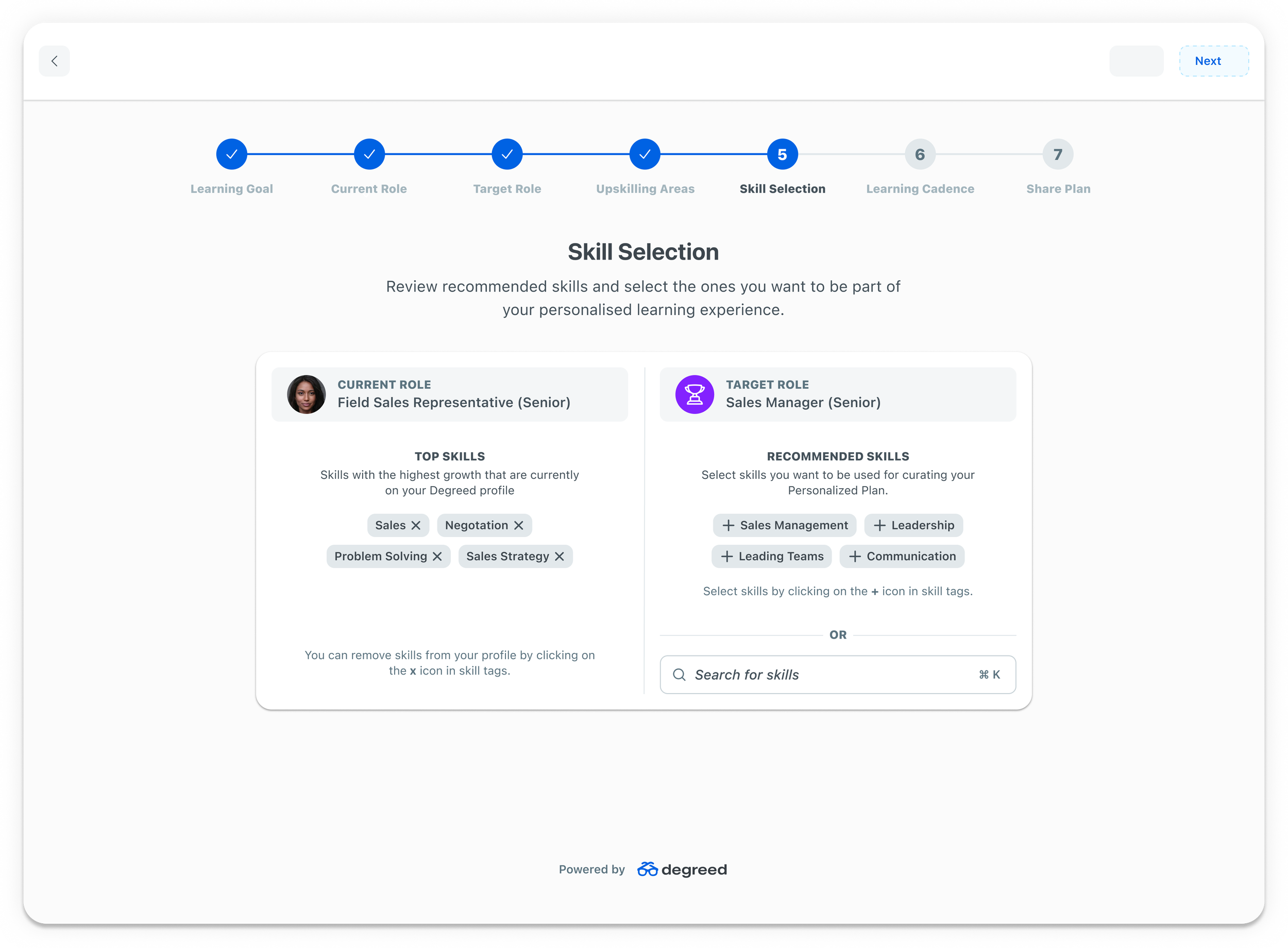 In this step, Degreed provides focused skill recommendations based on the learner's chosen goals and their existing skillset. Learners can either follow these recommendations or manually search for and select additional skills they find more relevant to their learning path.