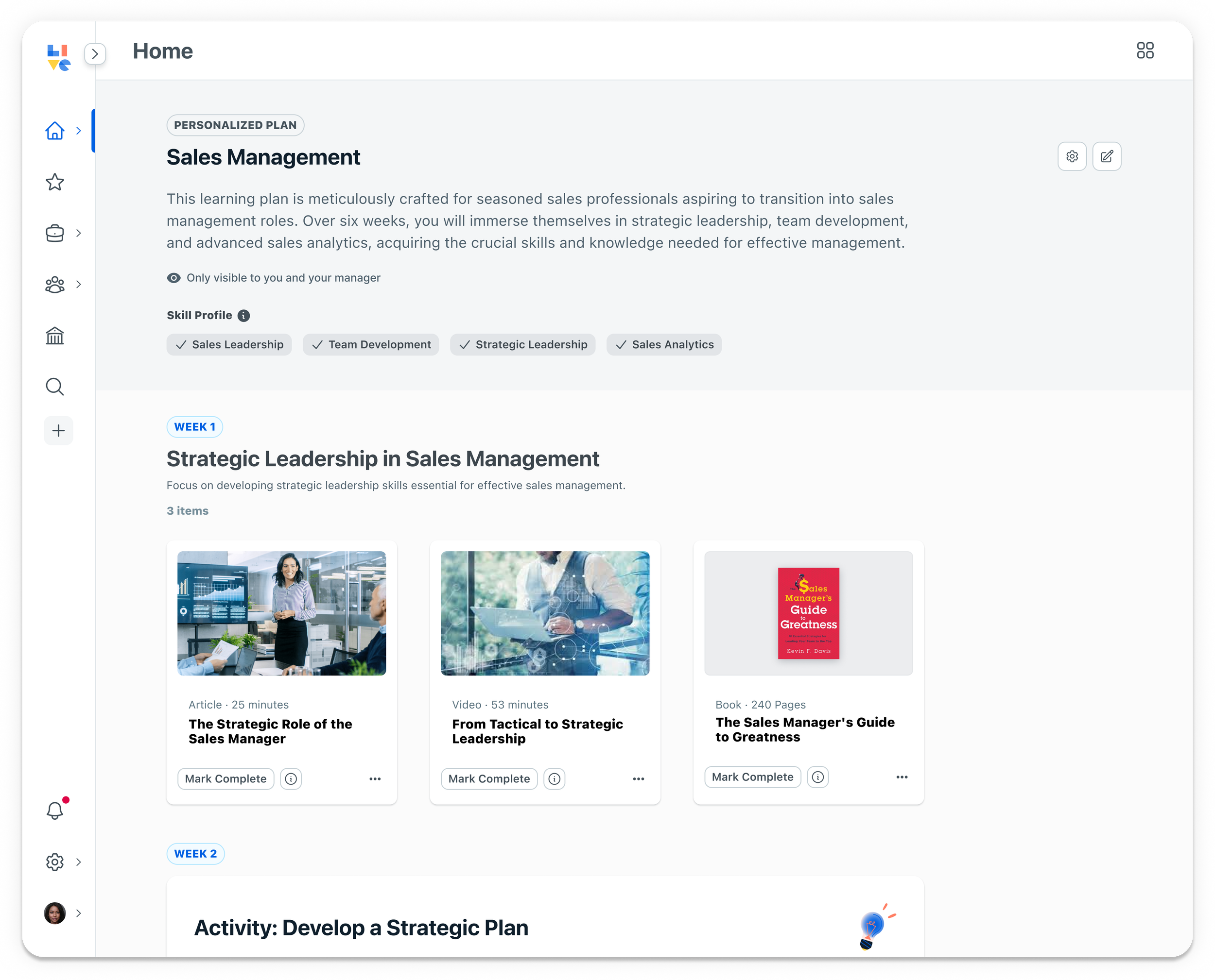 We created Personalised Plans to enhance the platform’s ability to guide learners in personalizing their learning journeys, bridging skill gaps more efficiently, and providing better tools for tracking and measuring their development.