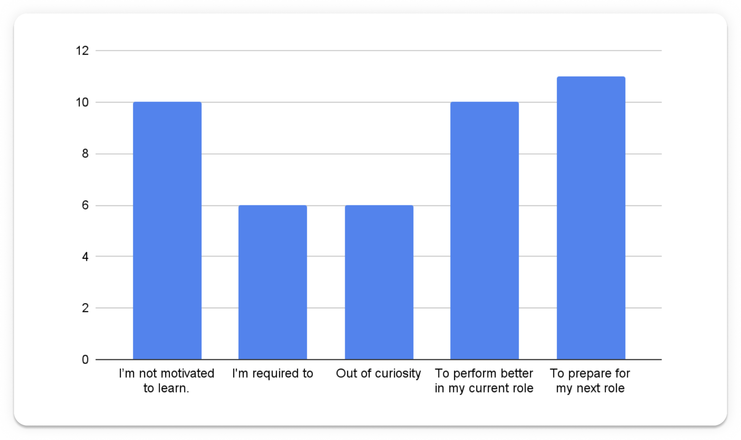 Survey results showed that while learners were primarily motivated by career advancement and skill growth, many struggled with goal setting and tracking. There was also a significant gap in managerial feedback and support for learners’ professional growth.
