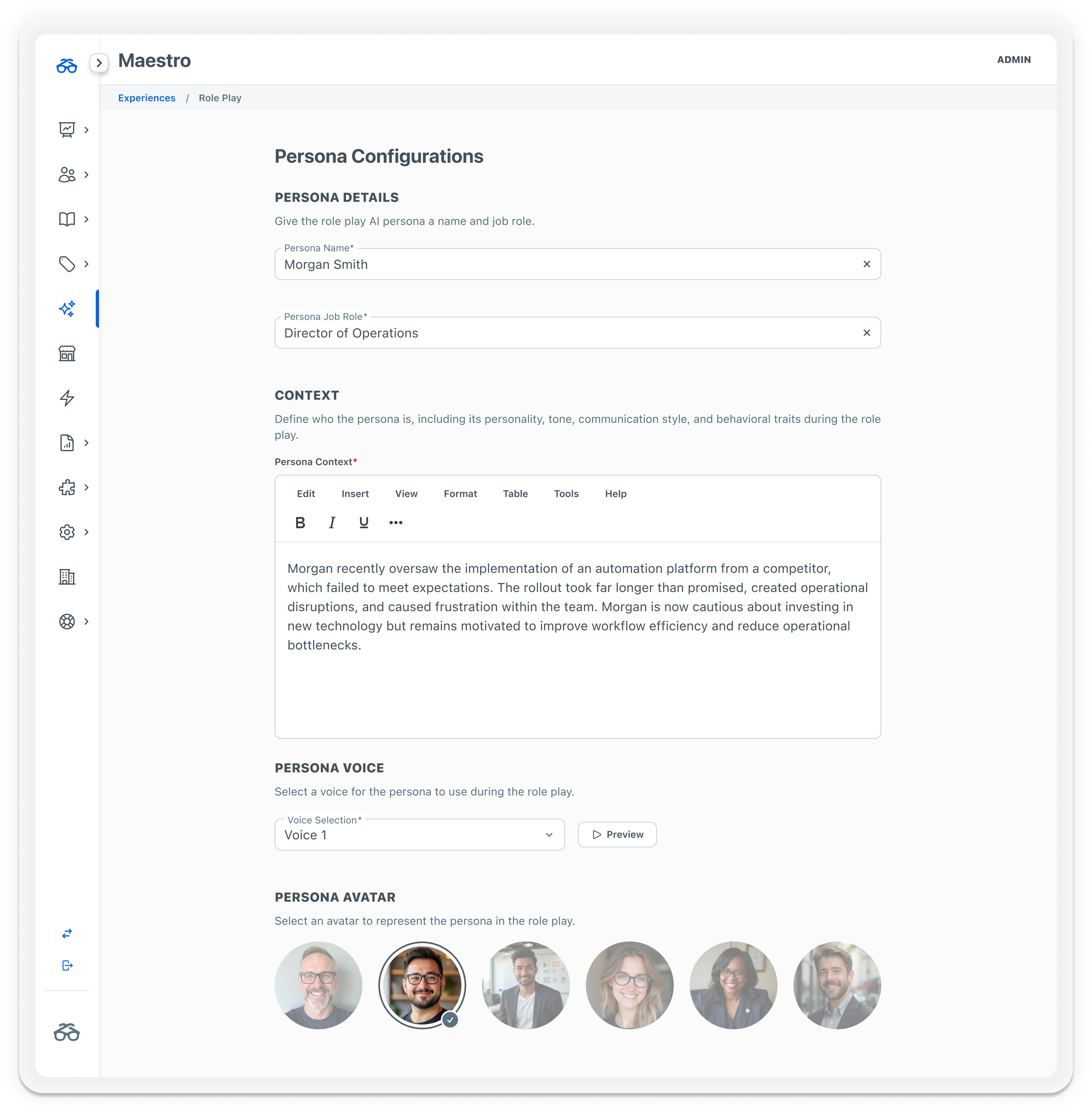 The persona configuration area enables administrators to create nuanced AI characters for role-play scenarios. Admins define each character's name, role, and contextual background—establishing their personality, communication style, and behavioral patterns.