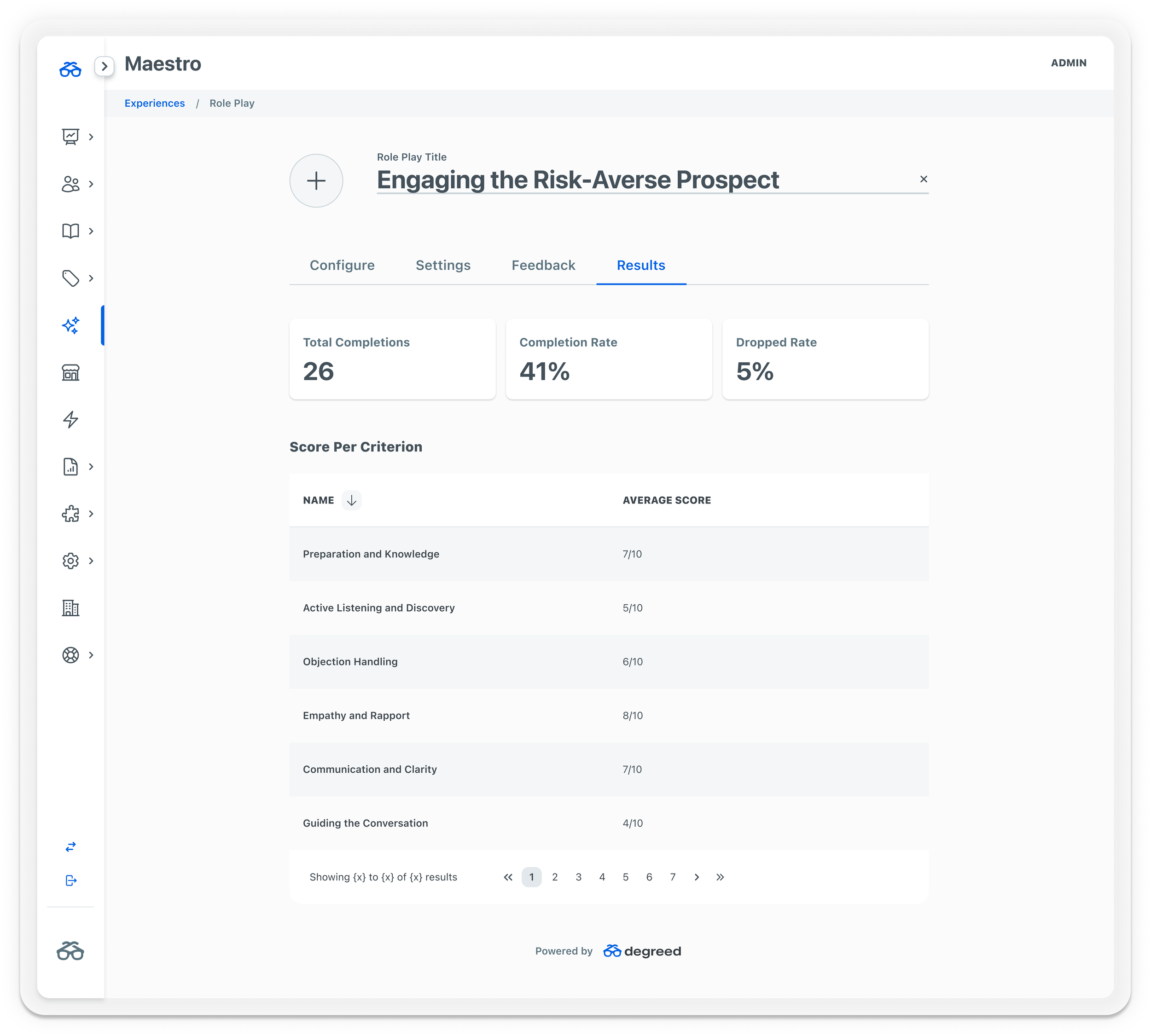 The results dashboard provides administrators with comprehensive performance analytics across role-play scenarios. Key metrics reveal engagement levels through completion and drop-off rates, while criterion-based scoring breaks down learner performance across specific competencies.