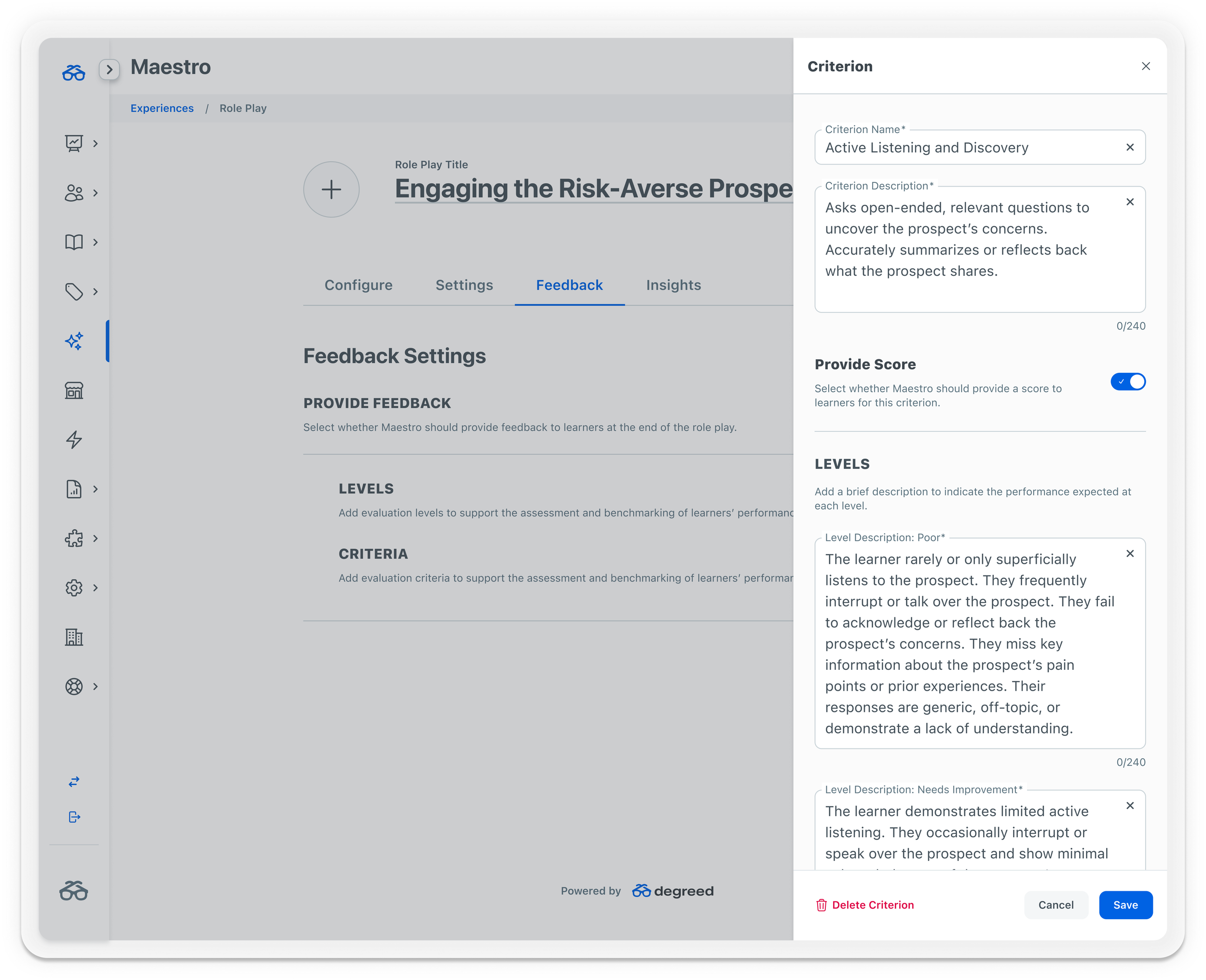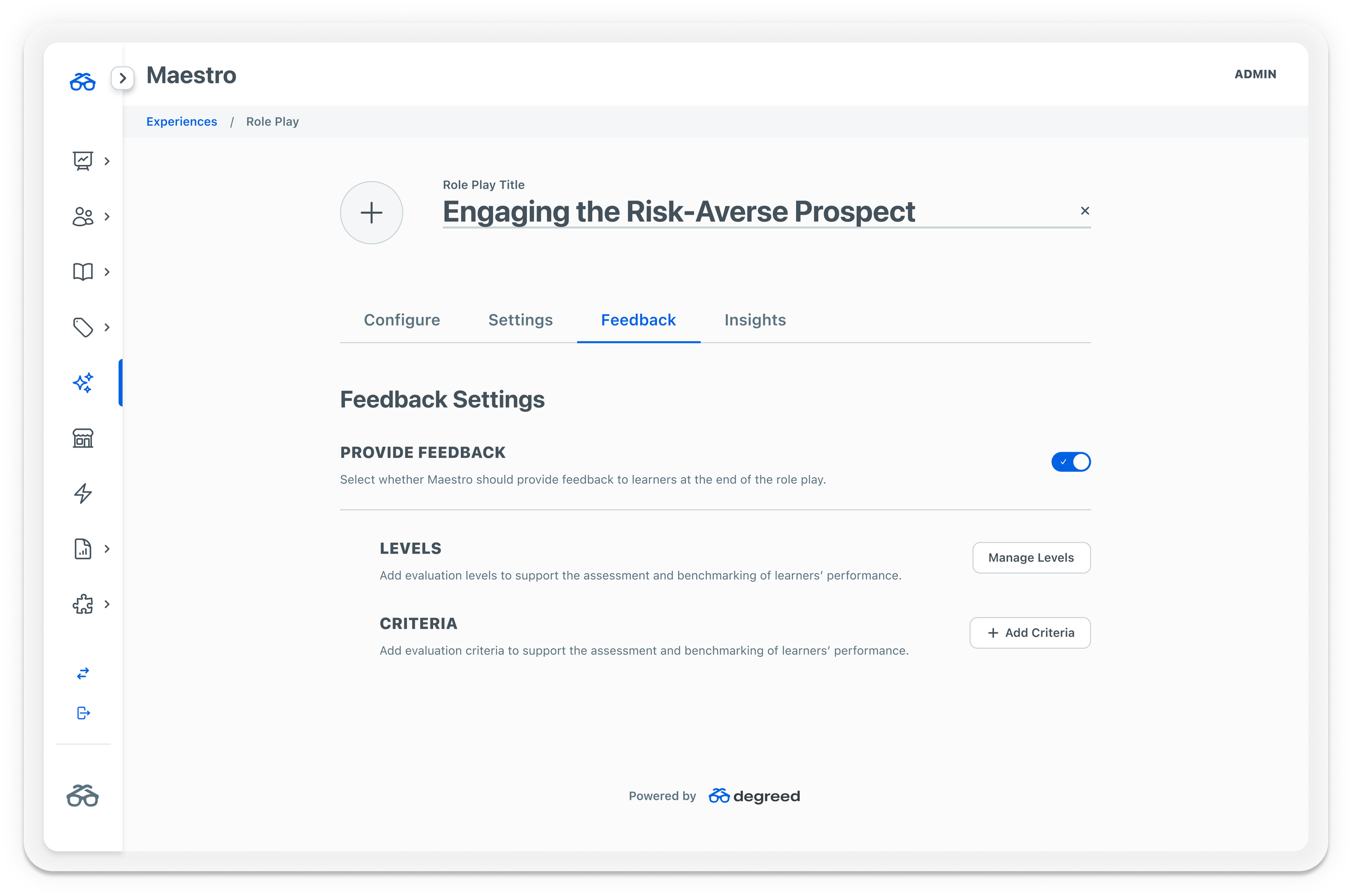 The feedback settings tab allows administrators to establish clear evaluation frameworks for each role-play. Admins can enable AI-generated feedback, define performance levels that benchmark learner progress, and set specific criteria that assess key competencies.