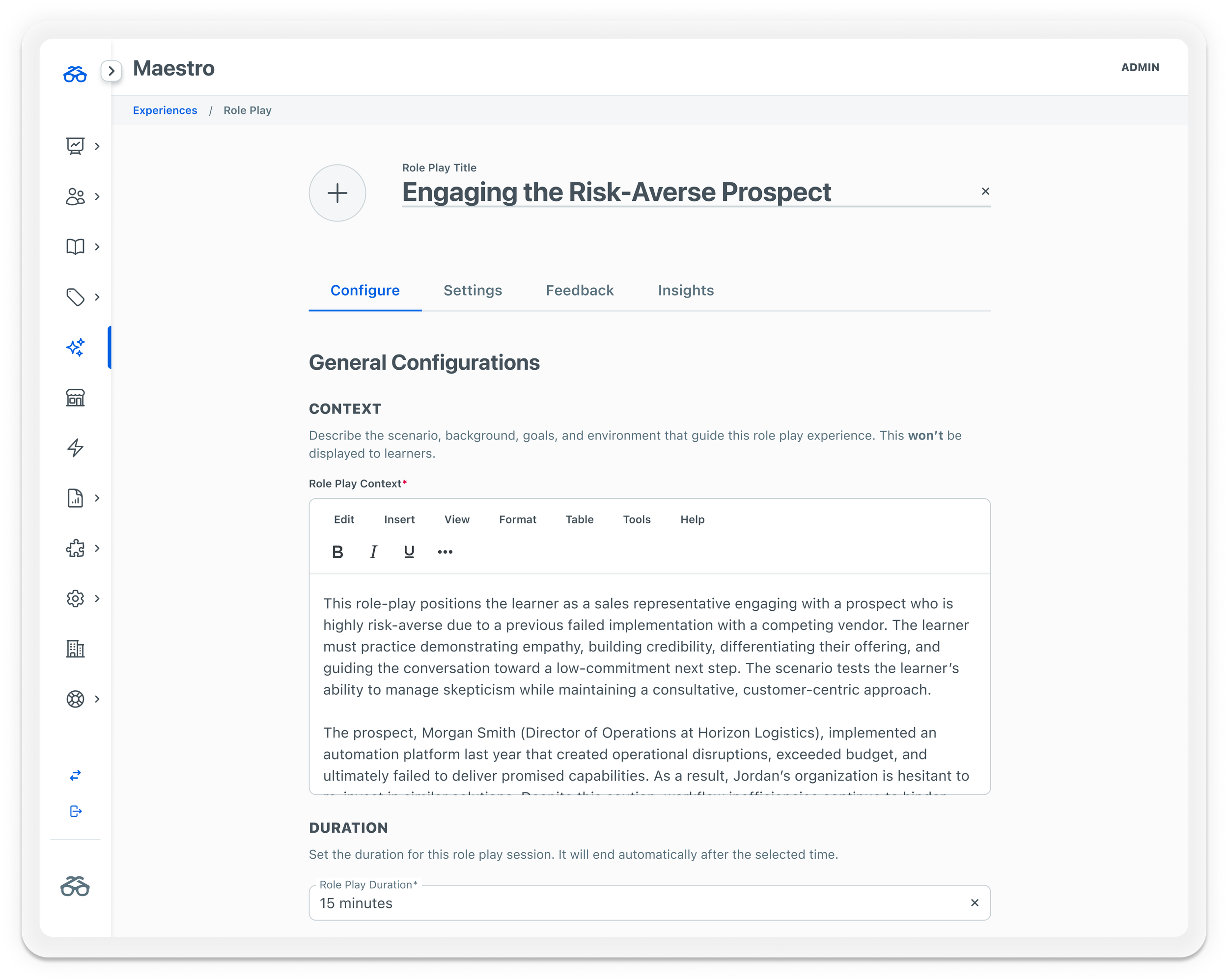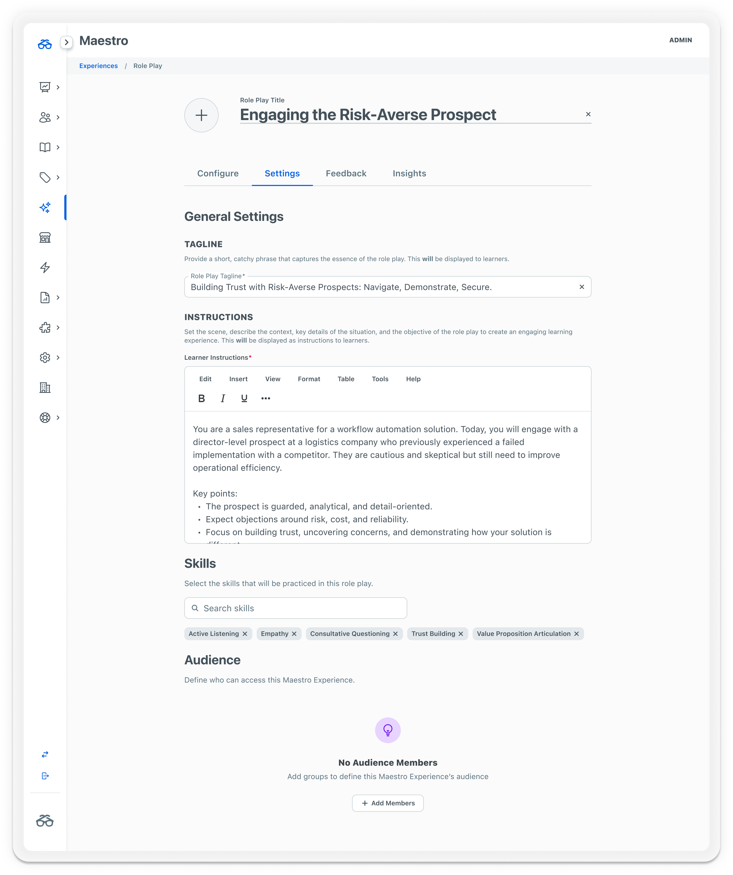 The settings interface gives administrators precise control over each role-play experience. Admins craft taglines that communicate the scenario's focus, write detailed instructions that set the context and objectives, and tag specific skills for targeted practice.