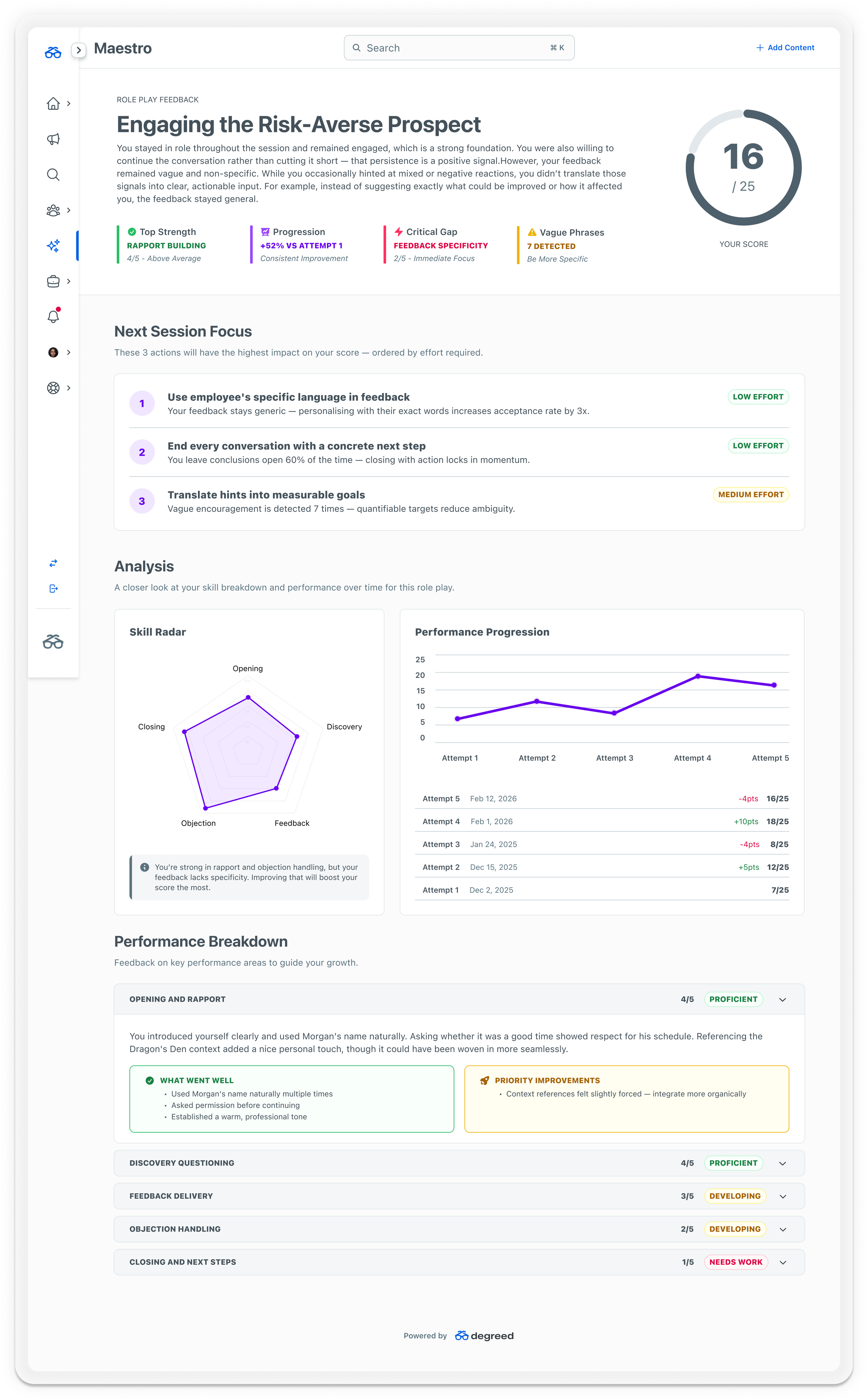 A detailed performance breakdown scores individual competencies, making skill growth concrete and measurable. Specific improvement recommendations provide clear next steps—not just what to improve, but how.