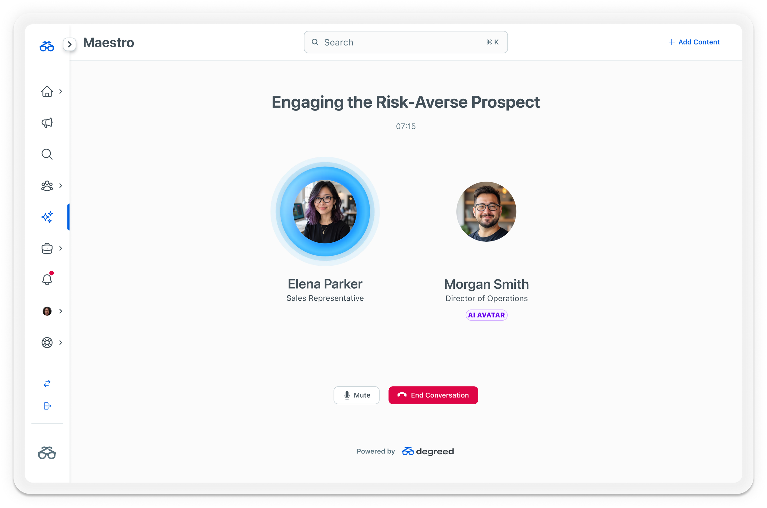 The learner interface creates a focused, distraction-free space for practicing challenging conversations. Learners see their own avatar and role and the AI persona they're engaging with, establishing clear context before the conversation begins.